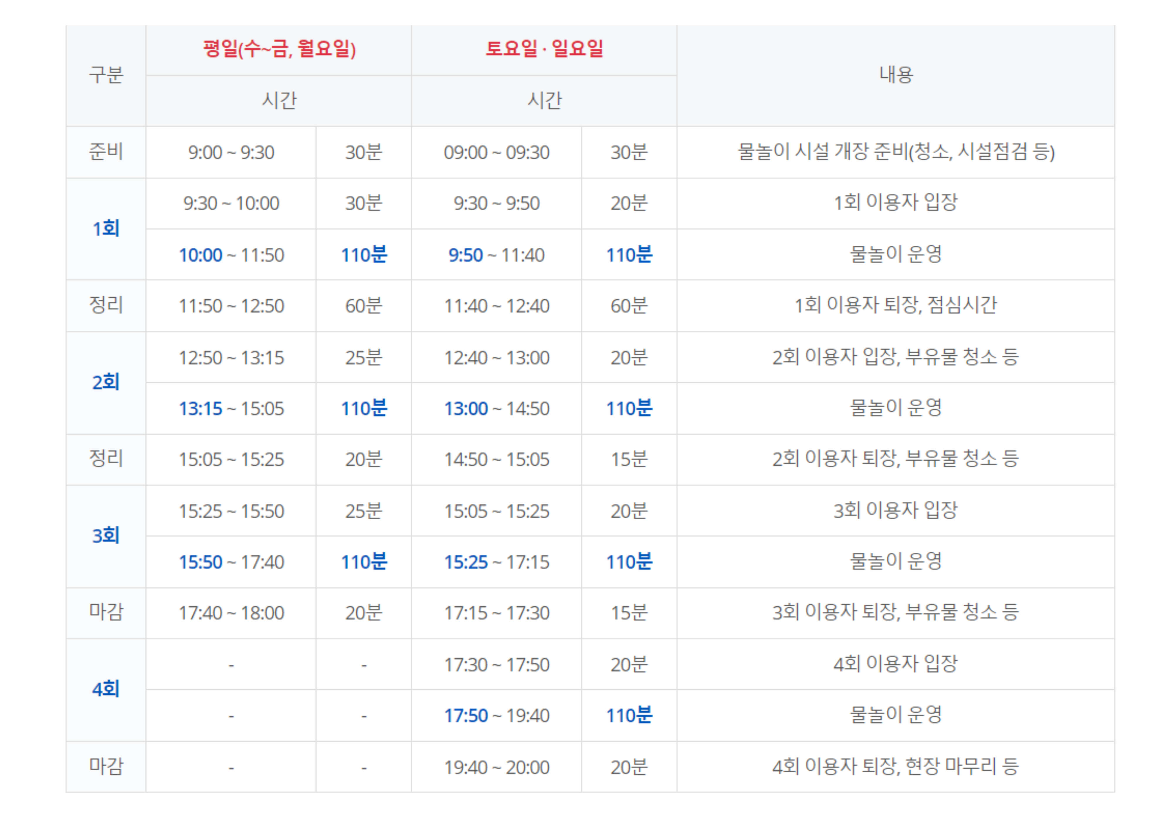 * 토,일: 4회 운영 (오전 1회, 오후 3회) => 1회 이용 시간 ( 50분 놀이 - 10분 휴식 - 50분 놀이 총 110분 운영)