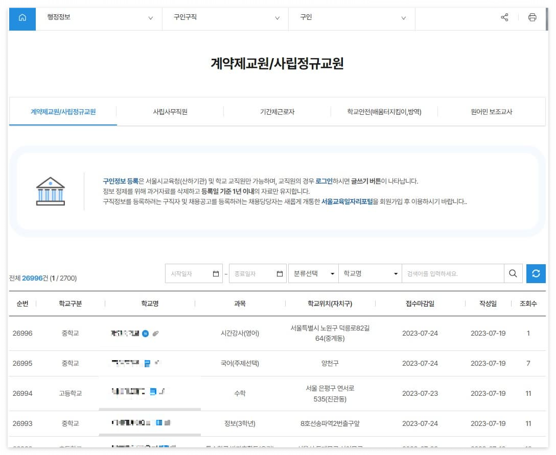 서울시 교육청 홈페이지에서는 계약제교원/사립정규교원, 사립사무직원, 기간제근로자, 학교안전( 배움터지킴이, 방역), 원어민 보조교사등의 구인정보를 찾아볼 수 있습니다.