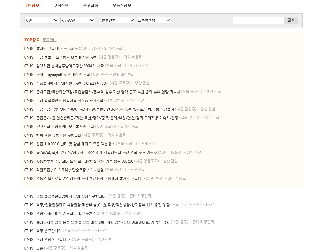 숙식제공 홀서빙, 요양병원 배식원, 주방직원, 화장품 용기 조립, 단순포장, 매장 판매 사원, 용접기사, 편의점 알바, 면세점 매장 직원, 수입 사무직, 영업사원, 자재정리, 형틀목수, 화장품포장검사, 외국인 생산직, 디자이너 일러스트레이터, 배송기사등 일자리 정보가 다양합니다.