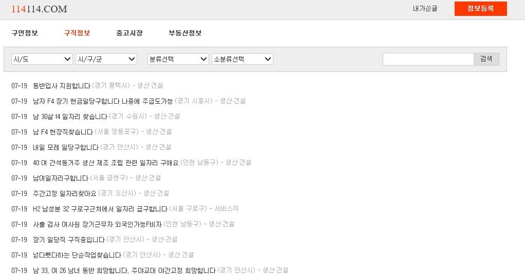 114114 구인 업무도 생산직, 판매직, 서비스직의 업무가 대부분이라 중장년층에게 용이하다는 평이 많습니다.