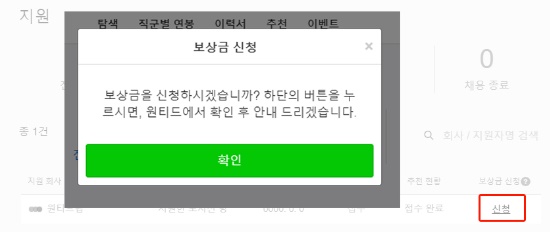 * 최종 합격했을 때, 보상급 지급 버튼을 누르셔야 하고, 3개월 초과 근무를 했을 때, 원티드에서 보상급 지급에 관한 메일을 받게 됩니다.