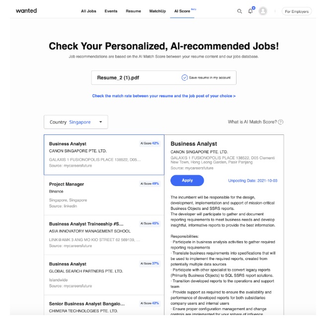 이력서를 업로드 해놓으면, 국내 외 영어권 유저도 나의 이력서에 맞는 원티드의 공고 기업 합격 예측을 해볼 수 있습니다.