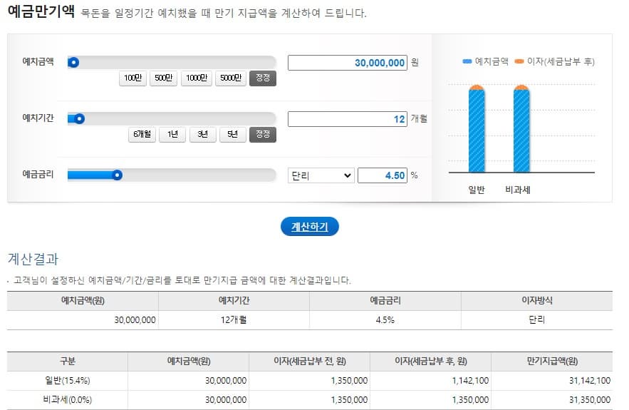 3천만원 기준으로 계산해보았고, 12개월 예치하고 금리는 연 4.5% 단리로 적용했습니다.